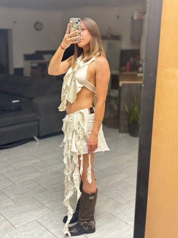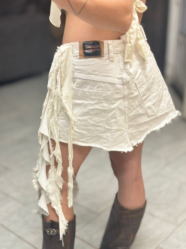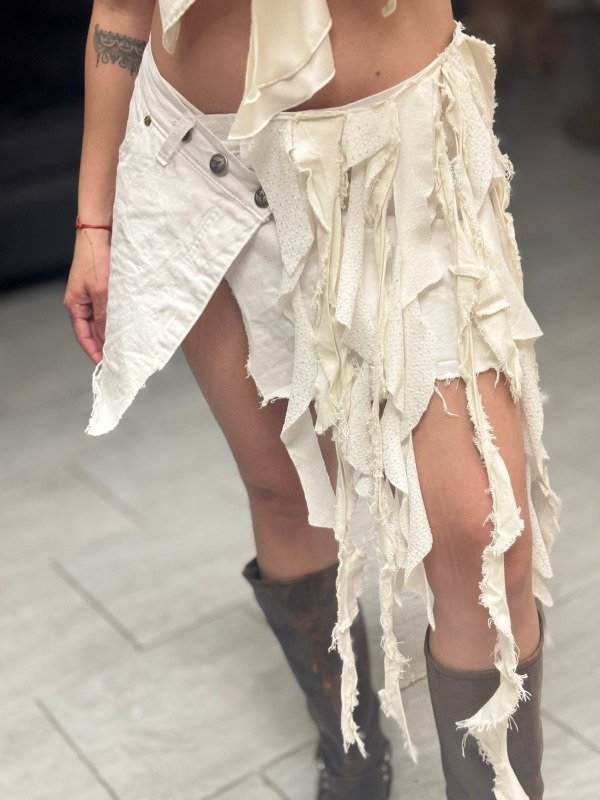 Pollera asimétrica de diseño artesanal, confeccionada a partir de denim reciclado y piezas textiles con diferentes texturas.