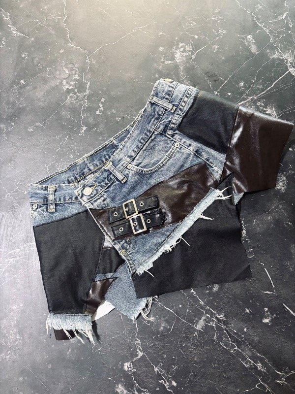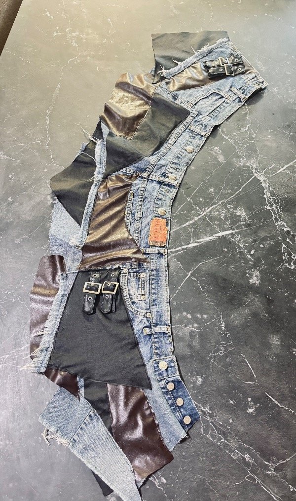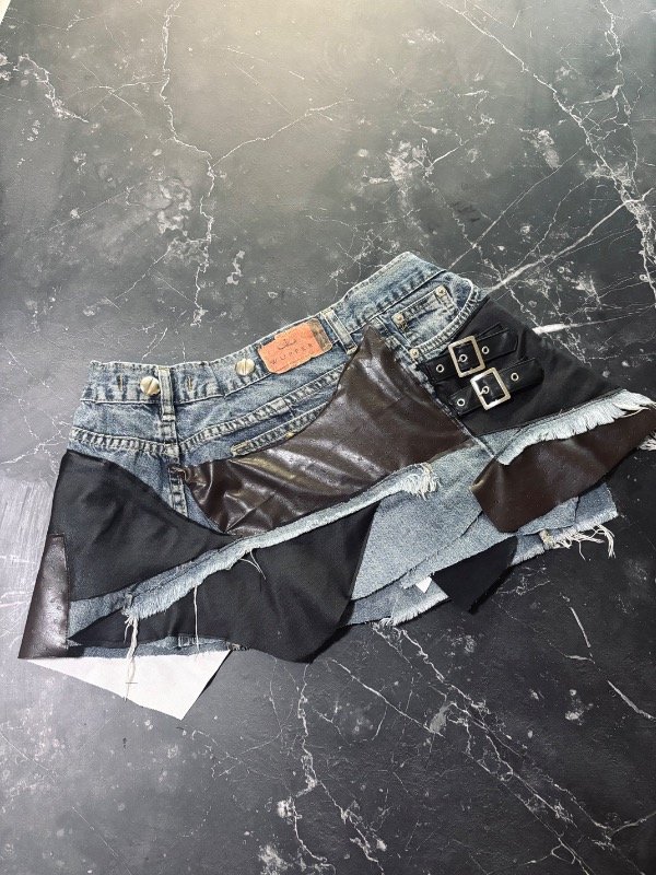 Hecha a partir de retazos de diferentes cueros y jean, buscando que cada retazo encaje de forma que el calce quede perfecto!