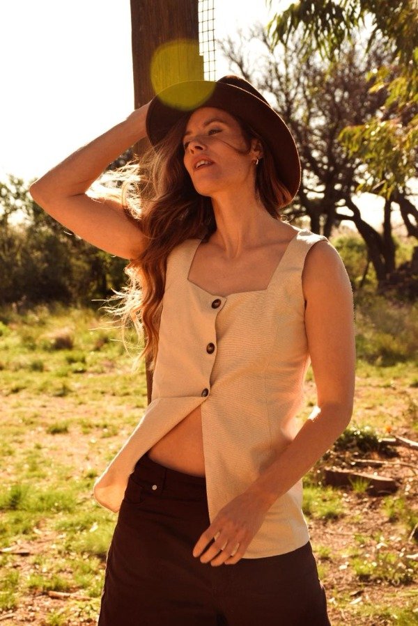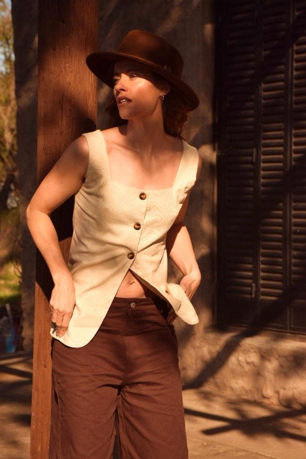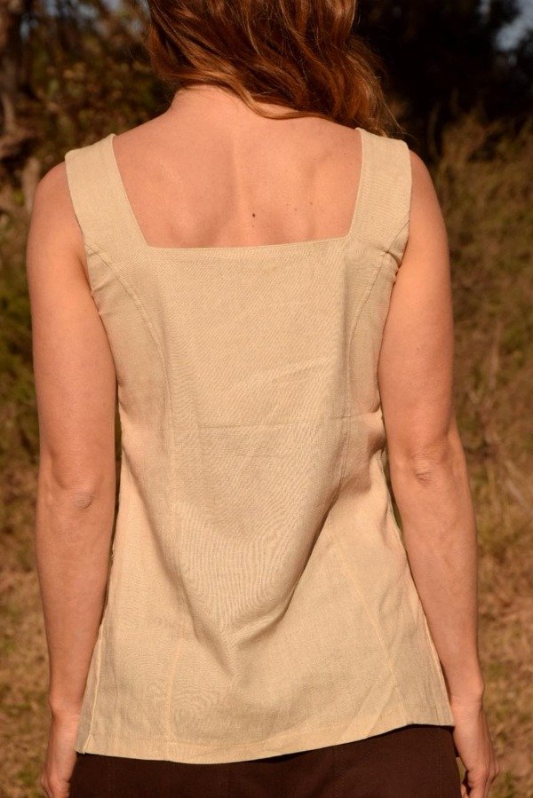 Top sin mangas confeccionado en lino fresco y liviano, ideal para la temporada de verano. Presenta escote cuadrado y botonadura frontal con botones de carey que aportan un toque natural y elegante. Su diseño largo y ligeramente abierto en el ruedo frontal estiliza la silueta y brinda libertad de movimiento. Espalda lisa con terminaciones prolijas. Perfecto para combinar con shorts, pantalones o faldas para un look sofisticado y relajado.