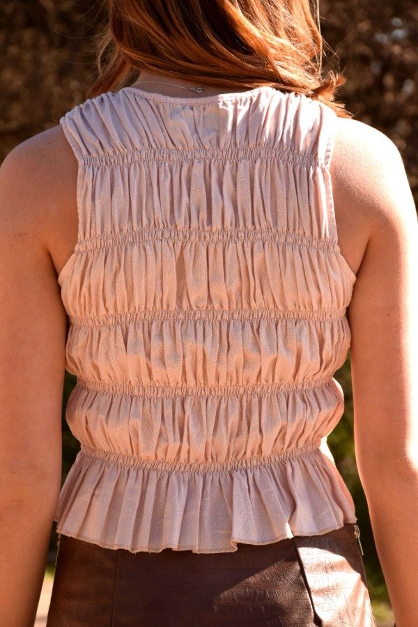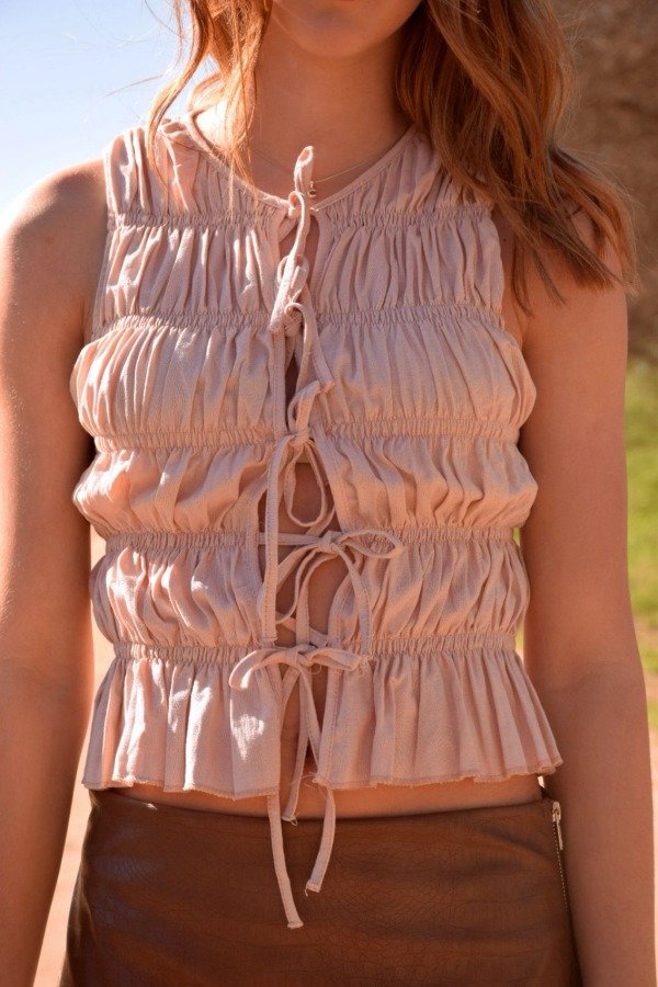 Confeccionada en lino, esta blusa sin mangas presenta un diseño fruncido en todo el cuerpo que aporta textura y elasticidad. Cuenta con cuatro lazos delanteros para cierre, permitiendo un ajuste regulable y un estilo femenino. El ruedo con volado delicado añade movimiento y un acabado romántico. Espalda completamente fruncida para un calce cómodo y adaptable.